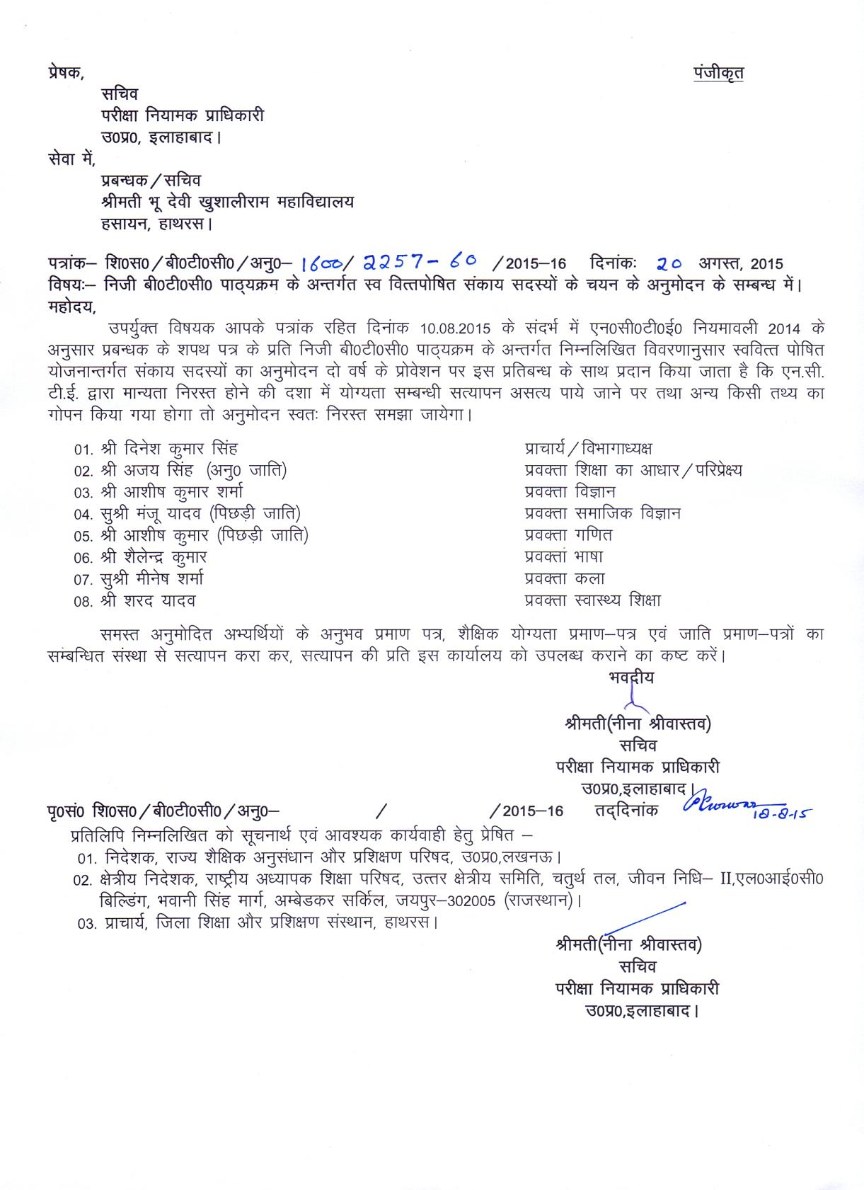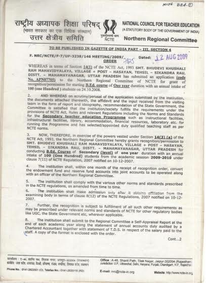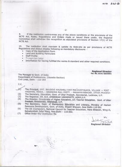 Courses & Seat Information Email :- secretary@sbkrpgc.com & Contact No. 09411653530 Teachers Approval Letter NCTE Format for Staff list of BTC NCTE Affidavit of secretary BTC NCTE Affiliation Letter for B.Ed. Page 1 NCTE Affiliation Letter for B.Ed. Page 2